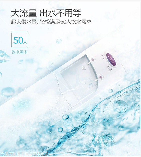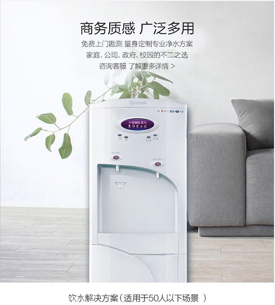 产品详情:产品介绍:垂直安装联接到市政自来水,可满足50人的日常饮用水。开水有常温水和冰水三种,有着过滤提示功用和臭氧杀菌功用。